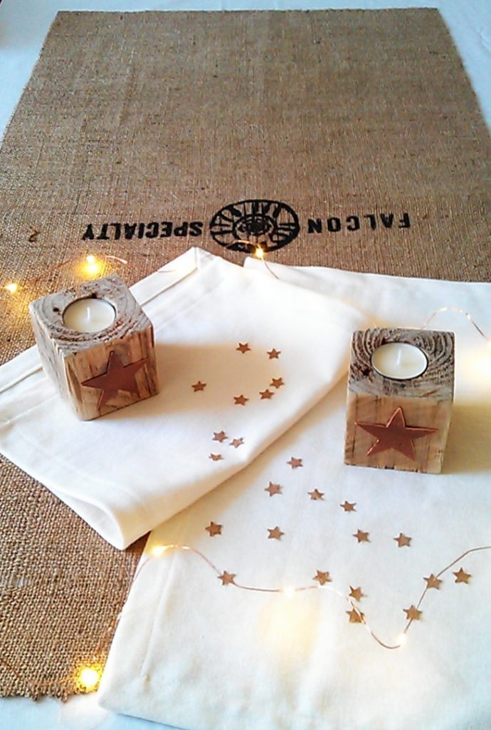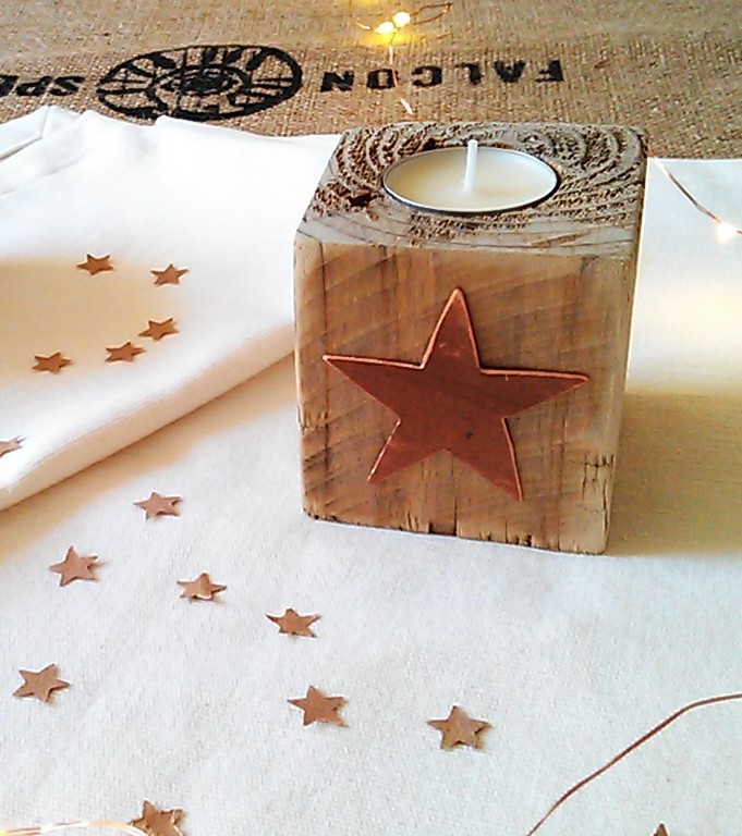 Tealight holders are made from pallet blocks and sizes may vary. The star motif is made from 22mm copper pipe and is 6cm to 6.5cm across the points.